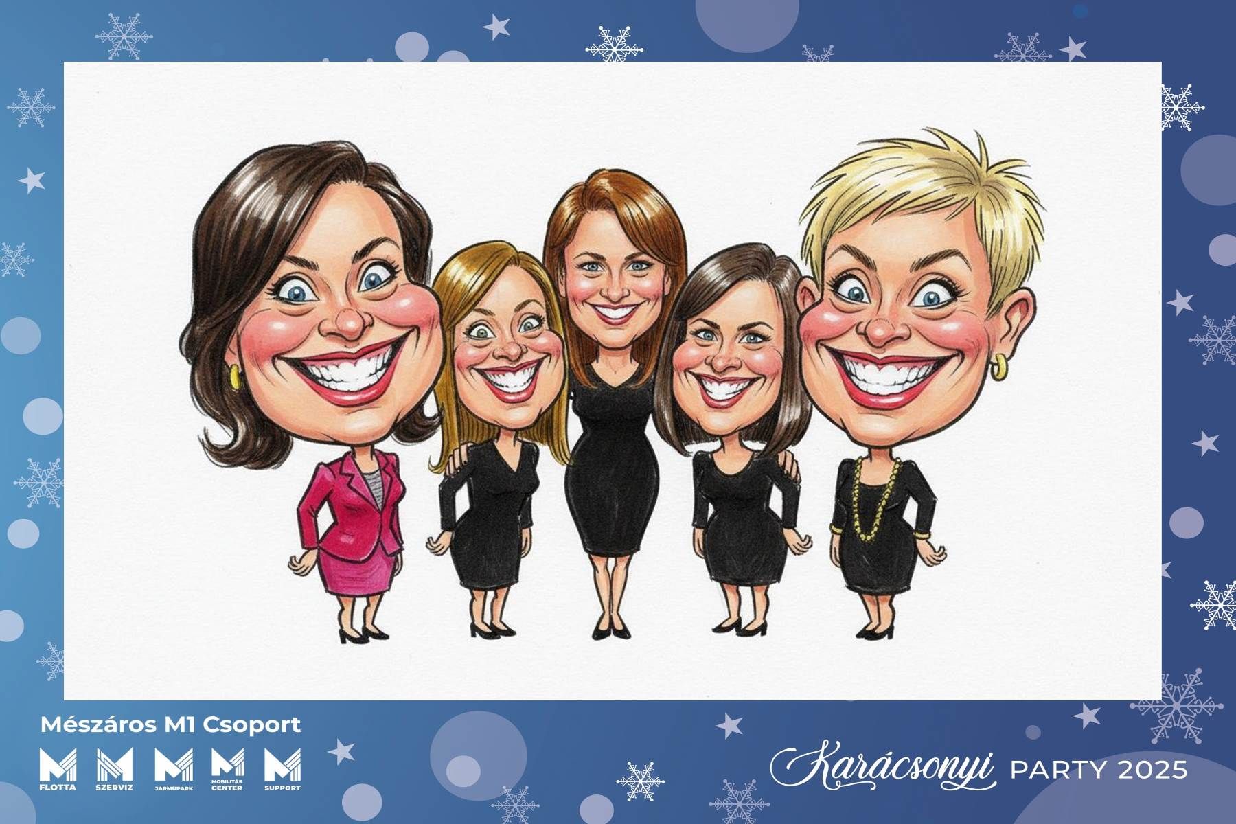 Egyszerre akár 5 főről tudunk karikatúrát készíteni. Egy karikatúra 1,5 perc alatt elkészül melyet azonnal emailben megosztunk, helyszínen kinyomtatunk.